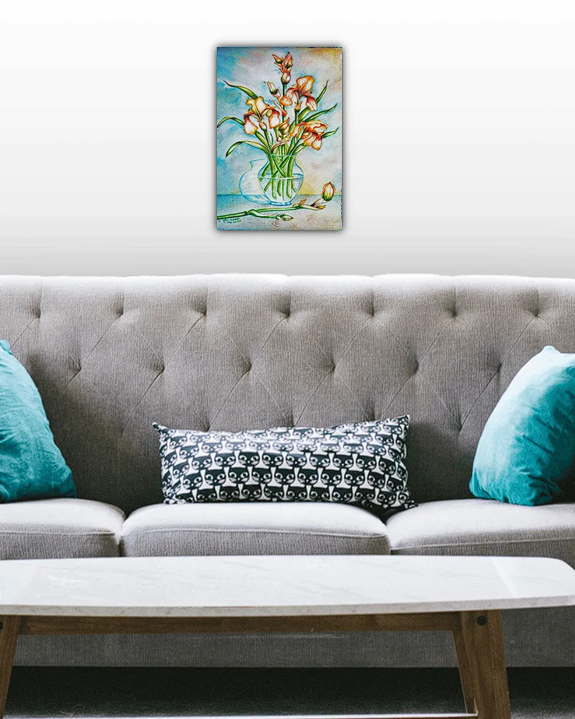 Ideal for lovers of floral art and botanical beauty, this piece blends intricate detail with watercolor’s signature fluidity. The balanced composition, featuring a graceful iris and its grounding vase, makes it a serene yet captivating addition to any space.