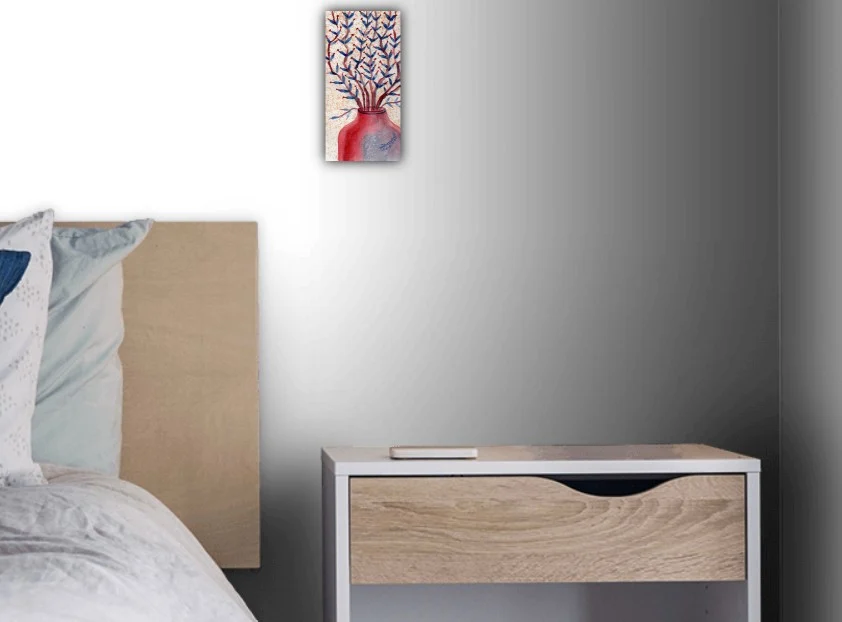 Blossoms in a Crimson Vase is a delicate watercolor painting that captures nature’s quiet beauty. A rustic red vase holds slender branches adorned with soft blue leaves and tiny red buds, creating a sense of gentle movement. The warm, textured background contrasts beautifully with the cool and warm tones of the foliage. This piece evokes serenity and artistic grace in a simple yet expressive form.