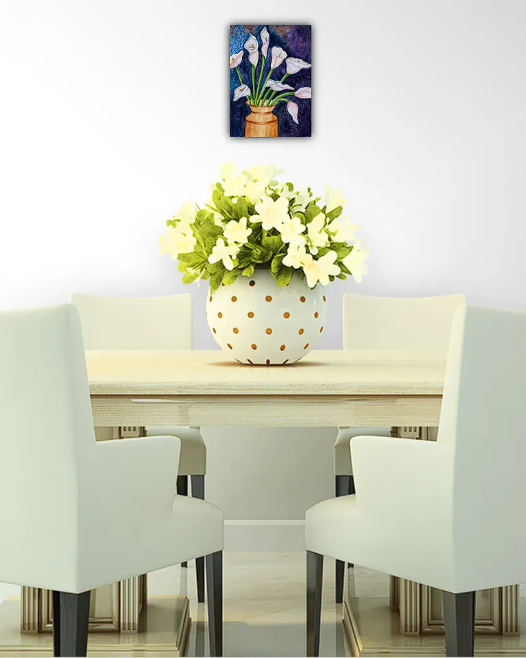 This piece is ideal for those who appreciate floral elegance and artistic refinement. Whether adorning a home, office, or gallery space, its delicate detailing and harmonious color palette create a tranquil and sophisticated ambiance, inviting a moment of serenity and contemplation.