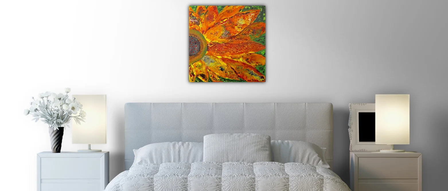 "Exquisite" bursts with energy through its vivid hues of orange, yellow, and gold—depicting the essence of a flower in its most luminous form. Each petal flows with layered texture and dynamic movement, blending fiery warmth with subtle undertones of green and blue. The center, rich with intricate details, anchors the composition, creating harmony between intensity and grace. The artwork radiates positivity and renewal, inviting the viewer to feel both grounded and uplifted.