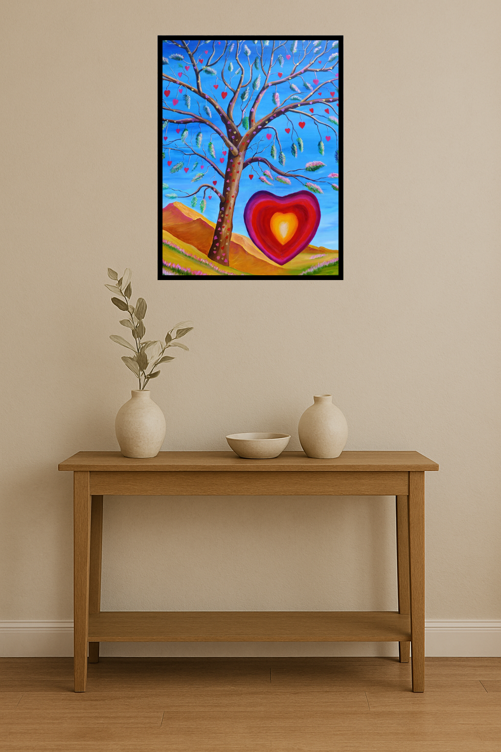 "Love" is a visceral 40x30 inch acrylic declaration created on September 9, 2014, that gives physical form to the heart's most powerful emotion. The artist builds sculptural layers of paint across the canvas's substantial 0.75-inch depth, with swirling cadmium reds and passionate crimsons erupting into three-dimensional peaks that cast actual shadows. Metallic gold and silver pigments catch changing light throughout the day, making the work evolve like love itself - now fiery intensity, now tender glow. The expansive 40-inch height gives the composition monumental presence, while palette knife scars in the paint surface suggest love's capacity to both wound and transform. This 2014 creation demonstrates acrylic's unparalleled ability to hold both controlled technique and raw emotional expression in perfect tension.