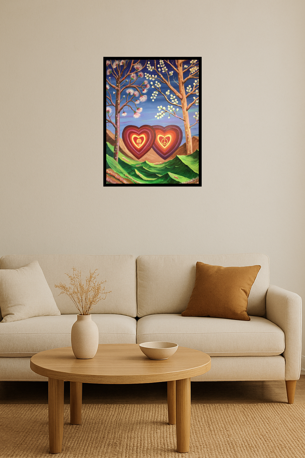 "Love and Peace II" is a masterful 40x30 inch acrylic evolution created on April 10, 2017, that deepens the conversation begun in its predecessor. The artist employs thickened acrylic gels to create a dramatic impasto terrain, where passionate vermilion peaks rise beside tranquil ultramarine valleys across the canvas's substantial 0.75-inch depth. Innovative interference pigments shift between violet and gold as viewers move, embodying love's transformative power to alter perspectives. The expansive composition balances spontaneous drips with precisely placed metallic accents, demonstrating how acrylic's versatility can contain both chaos and order - much like the human heart. This 2017 work pushes beyond pure abstraction, with subtle figurative elements emerging like memories from the vibrant texture.