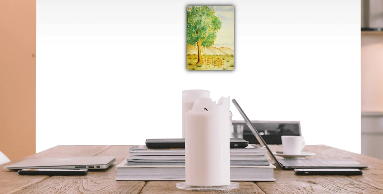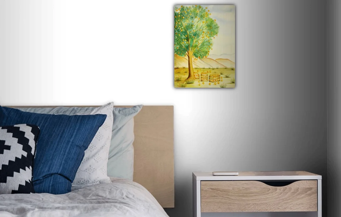 "Orange Tree" radiates warmth and life, capturing the golden glow of ripe oranges beneath a clear sky. The soft hills in the background and neatly gathered crates reflect a moment of harvest — a symbol of growth, fulfillment, and harmony with nature.