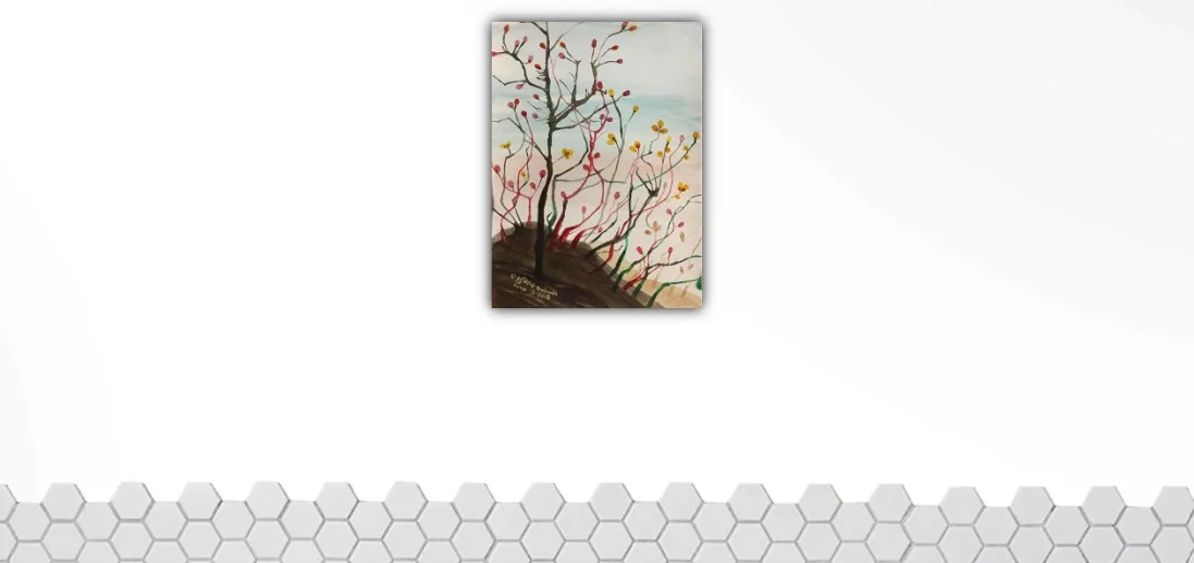 "Spontaneous" captures the unrestrained joy of nature’s wild growth. Dark and colorful stems twist upward, dotted with vivid red buds and yellow blooms, their paths unpredictable yet full of life. The watercolor medium enhances the organic movement, giving each branch a unique rhythm as they stretch into a soft, open sky. It’s an expressive piece that celebrates freedom, energy, and natural creativity.