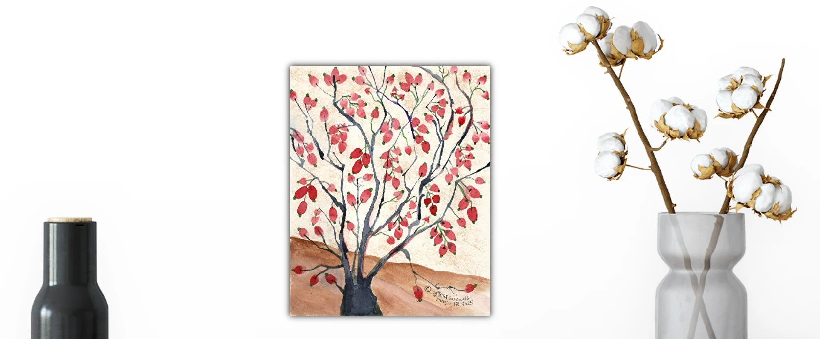 “The Blushing Tree” is a graceful watercolor depicting a blooming tree with vivid red blossoms and fluid, expressive movement.