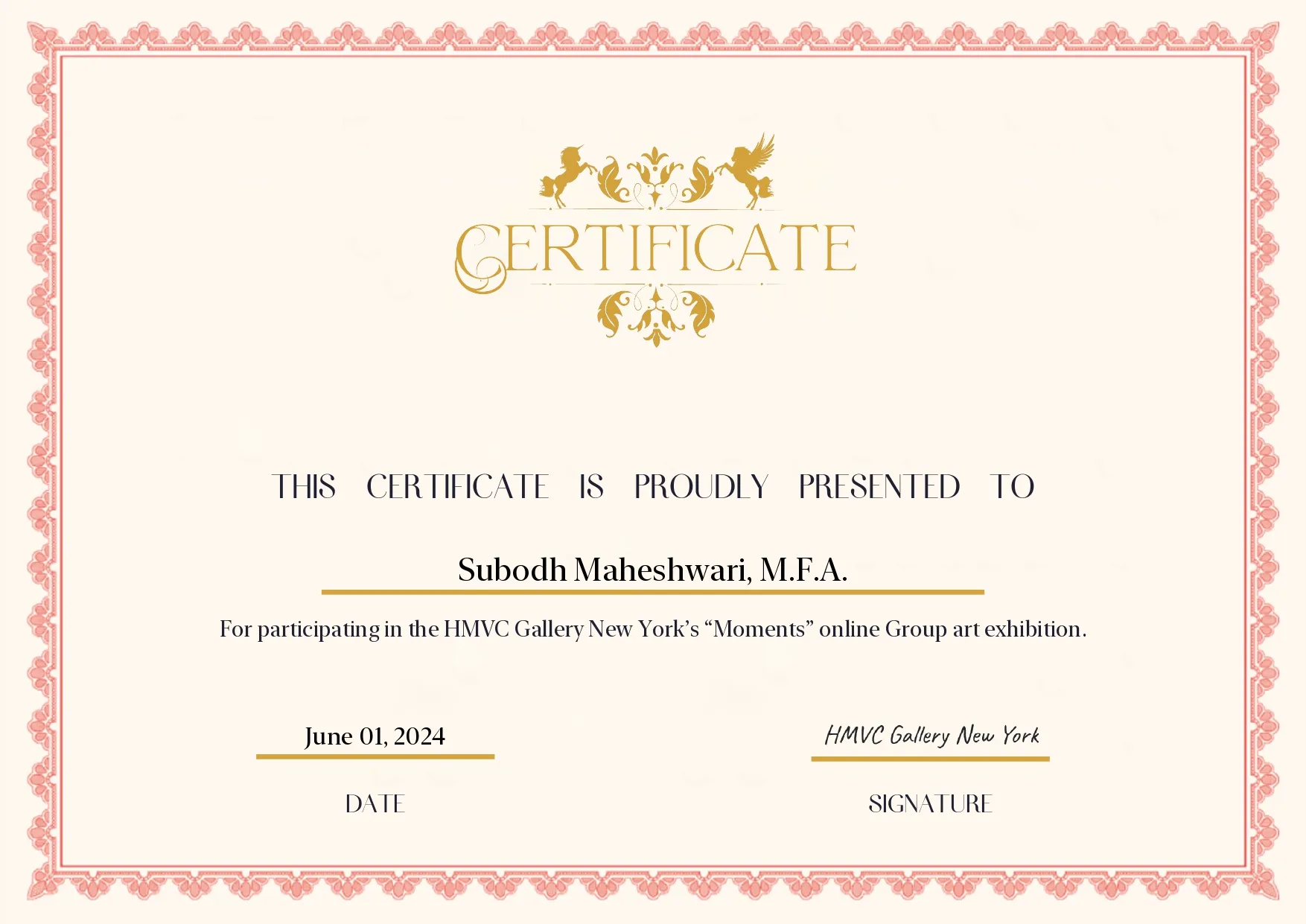 Internationally acclaimed artist Subodh Maheshwari, M.F.A. participated in HMVC Gallery New York's Moments online group exhibition throughout June 2024. This virtual showcase brought together contemporary artists to interpret and capture life's fleeting yet meaningful moments through diverse visual mediums.
